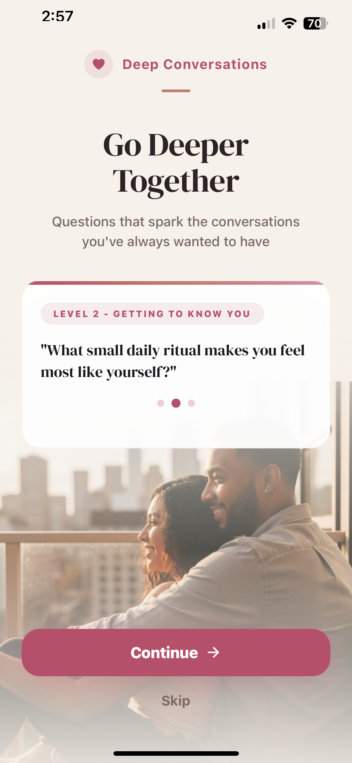 From fun icebreakers to raw vulnerability. Progress through each level together and watch your connection deepen.